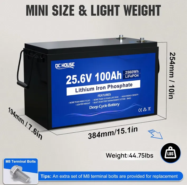 Літій-залізо-фосфатний акумулятор DC HOUSE 24V 100A (25.6V) 2560Ah з BMS призначений для використання в гібридних інверторах і системах резервного живлення. Цей акумулятор забезпечує стабільну й безпечну роботу завдяки технології LiFePO4, яка вирізняється тривалим терміном експлуатації та високою ефективністю.